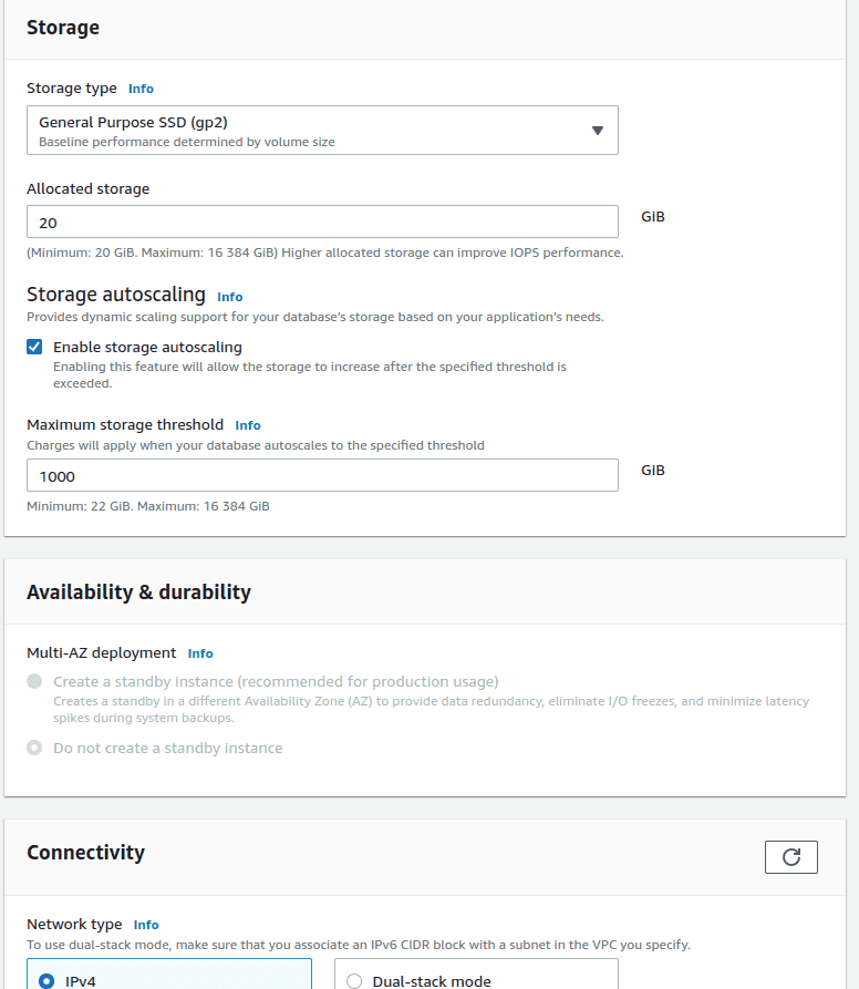 Choose the default db.t3.micro instance. You can of course modify the configuration to fit your needs, but this guide will choose the cheapest options. Select to create a new VPC.