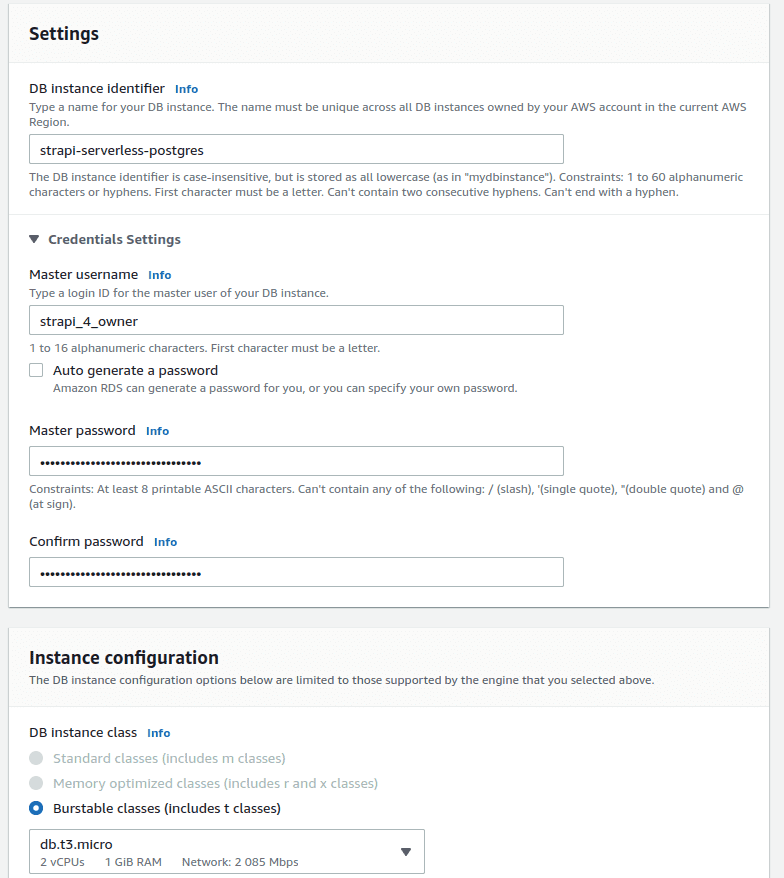 This guide will set up a free tier PostgreSQL database in AWS. This is a good choice as it’s free for 12 months and has good enough performance for using Strapi as a CMS. Having the database in the AWS system is also practical, as we don’t need to subscribe to more services. You can choose to use serverless AWS Aurora with PostgreSQL compatibility, but this offering does not have a free tier and will cost about 0.70$ per day for the cheapest option.