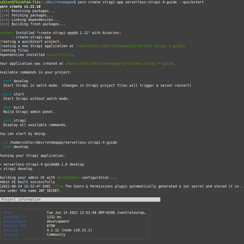 yarn create strapi-app serverless-strapi-4-guide --quickstartThis will create a new folder and automatically install the dependencies, start Strapi and open a browser window. If it does not open, just visit http://localhost:1337/admin to see the admin dashboard. You can register a user to see that it works, but we will change databases and not use this user later.