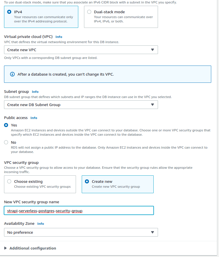 Monitoring can be useful if you plan to use this database in production, but it will add some cost if you go above the free tier of CloudWatch logs. Choose an initial database name such as “strapi4”. The rest of the options can just the the default ones.